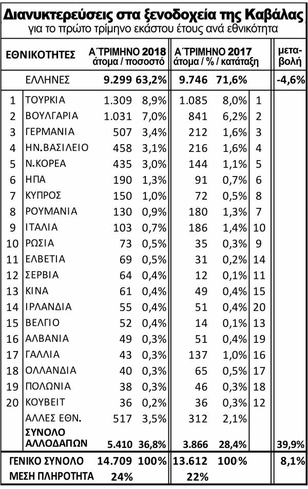 Οι φετινοί επισκέπτες του Α΄τριμήνου στην Καβάλα ήταν αυξημένοι κατά 1.100 άτομα περίπου σε σχέση με την αντίστοιχη περίοδο πέρυσι, ή κατά ποσοστό της τάξης του 8%. Αυτό που άλλαξε ήταν το μείγμα Ελλήνων – αλλοδαπών, με τους δεύτερους να παρουσιάζουν αύξηση της τάξης του 40%.