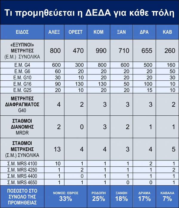 Ενδεικτικά: η ΔΕΔΑ θα προμηθευτεί για την πόλη της Καβάλας μόλις 260 μετρητές ενώ για την πόλη της Κομοτηνής 1.000 μετρητές (σχέση 1 προς 4). Ο Έβρος θα έχει πενταπλάσιους μετρητές από την Καβάλα, η Ξάνθη τριπλάσιους και η Δράμα υπερδιπλάσιους.