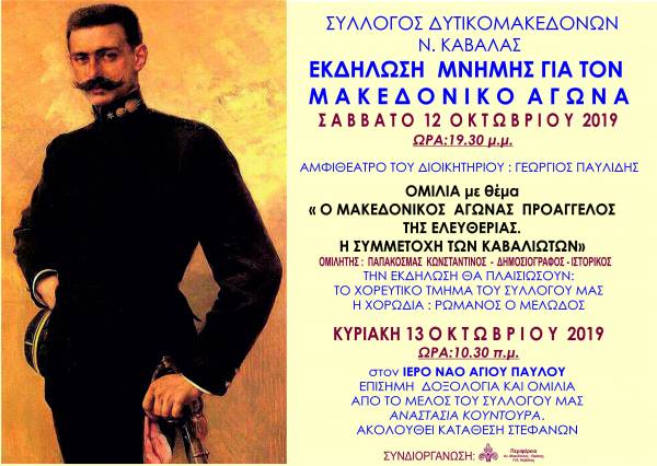 19:30 Αμφιθέατρο ΠΕ Καβάλας «Γεώργιος Παυλίδης». Εκδήλωση αφιερωμένη στην Ημέρα Μνήμης του Μακεδονικού Αγώνα, (συνδιοργάνωση του Συλλόγου Δυτικομακεδόνων Ν. Καβάλας και της Περιφερειακής Ενότητας Καβάλας). Ομιλητής ο κ. Κωνσταντίνος Παπακοσμάς, πρώην Αντιπεριφερειάρχης ΑΜΘ, με θέμα: «ο Μακεδονικός Αγώνας, Προάγγελος της Ελευθερίας και της Ενσωμάτωσης της Μακεδονίας στον Εθνικό Κορμό. Η συμμετοχή των Καβαλιωτών». Την εκδήλωση πλαισιώνουν η χορωδία του Συλλόγου «Ρωμανός ο Μελωδός» και το χορευτικό τμήμα του Συλλόγου Δυτικομακεδόνων Ν. Καβάλας.
