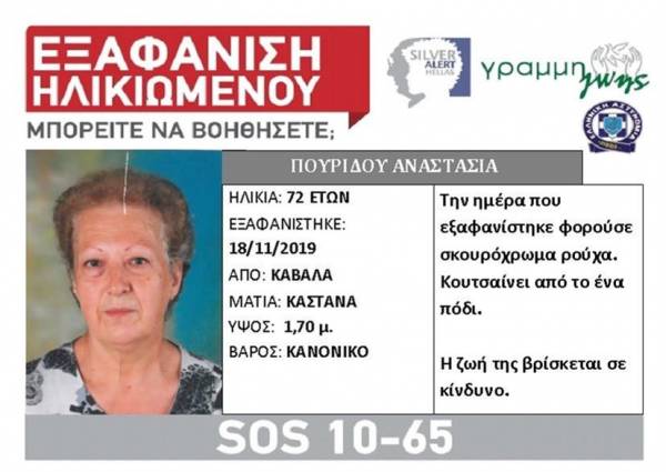 Συγκεκριμένα, ο 72χρονη εξαφανίσθηκε την 18/11/2019, από το σπίτι της στην Καβάλα.