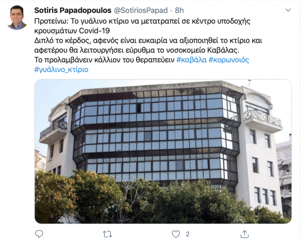 Την άποψη να μετατραπεί το γυάλινο κτίριο του Παληού Νοσοκομείου της Καβάλας σε κέντρο υποδοχής κορωνοϊού εξέφρασε σήμερα στο twitter ο δημοτικός σύμβουλος Σωτήρης Παπαδόπουλος. Συγκεκριμένα, έγραψε: Προτείνω: Το γυάλινο κτίριο να μετατραπεί σε κέντρο υποδοχής κρουσμάτων Covid-19 Διπλό το κέρδος, αφενός είναι ευκαιρία να αξιοποιηθεί το κτίριο και αφετέρου θα λειτουργήσει εύρυθμα το νοσοκομείο Καβάλας. Το προλαμβάνειν κάλλιον του θεραπεύειν