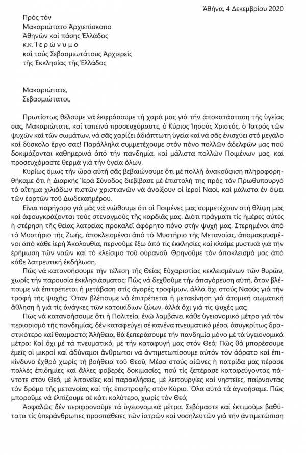 Όπως αναφέρει η επιστολή “Πως να κατανοήσουμε ότι η Πολιτεία, ενώ λαμβάνει κάθε υγειονομικό μέτρο για τον περιορισμό της πανδημίας, δεν καταφεύγει σε κανένα πνευματικό μέσο, ασυγκρίτως δραστικότερο και θαυμαστό; Αλήθεια, θα ξεπεράσουμε την πανδημία μόνο με τα υγειονομικά μέτρα; Και όχι με τα πνευματικά, με την καταφυγή μας στον Θεό”;