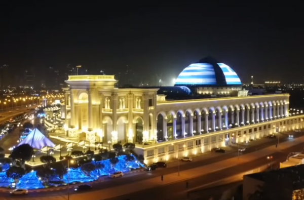 Η Ελληνική σημαία φωταγώγησε τον περιστρεφόμενο θόλο του Al Hazm Mall, του λαμπρότερου εμπορικού κέντρου του Κατάρ, το οποίο έχει επιστρωθεί με το φημισμένο, ολόλευκο μάρμαρο Θάσου.