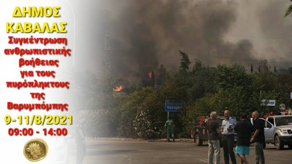 Ο Δήμος Καβάλας στέκεται στο πλευρό των κατοίκων της Βαρυμπόμπης Αττικής που επλήγησαν από την καταστροφική πυρκαγιά της 3ης Αυγούστου 2021. Οι συμπατριώτες μας, σύμφωνα με ανακοίνωση του Δήμου Αχαρνών, έχουν ανάγκη από τα εξής είδη: