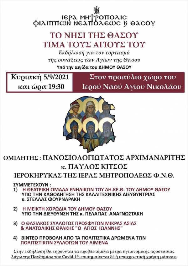 «Aπό την Ιερά Μητρόπολη Φιλίππων, Νεαπόλεως και Θάσου, ανακοινώνεται ότι εδώ και δύο έτη και κατόπιν της σχετικής εγκρίσεως της Ιεράς Συνόδου της Εκκλησίας της Ελλάδος, ωρίσθηκε να εορτάζεται η Σύναξις πάντων των εν Θάσω αγίων την πρώτη Κυριακὴ µηνὸς Σεπτεµβρίου εκάστου έτους.