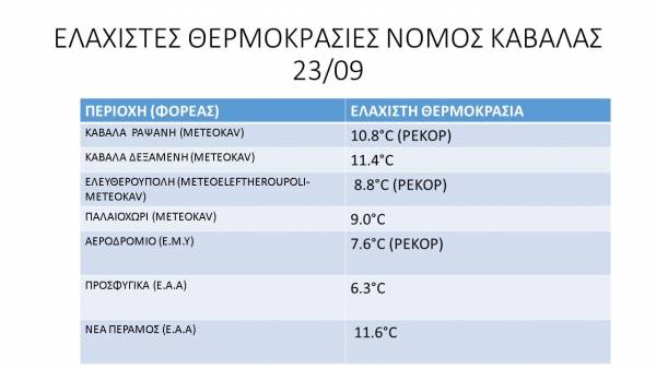 Θερμοκρασίες σε μονοψήφιες τιμές σημειώθηκαν το πρωί της Πέμπτης 23/9 στα ηπειρωτικά της Καβάλας ενώ στα παράκτια και στην πόλη οι θερμοκρασίες πλησίασαν τους 10°C.