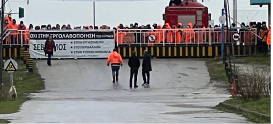 Στη φωτό, η κ. Σάρδη αποχωρεί από την πύλη του εργοστασίου Σίγμα, με τους καταληψίες της εγκατάστασης παρατεταγμένους και με το όχημα της πυρασφάλειας (!) παρκαρισμένο με την όπισθεν για υποστήριξη της κατάληψης με ρίψη νερού».