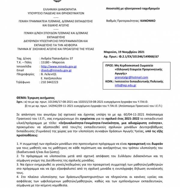 Το έγγραφο της έγκρισης από το Υπουργείο Παιδείας και Θρησκευμάτων είναι το εξής: