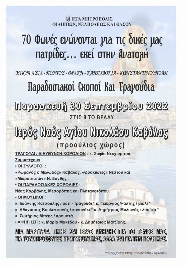 Το μουσικό αυτό αφιέρωμα στις αλησμόνητες Πατρίδες του Ελληνισμού, το οποίο τελεί υπό την ευλογία του Σεβ. Μητροπολίτου Φιλίππων, Νεαπόλεως και Θάσου κ. Στεφάνου, θα πραγματοποιηθεί την Παρασκευή 30 Σεπτεμβρίου 2022 στις 8 το βράδυ στον προαύλιο χώρο του Ιερού Ναού αγίου Νικολάου Καβάλας (είσοδος δωρεάν).
