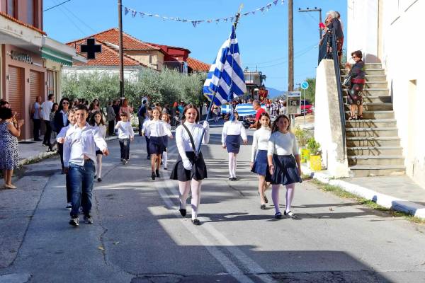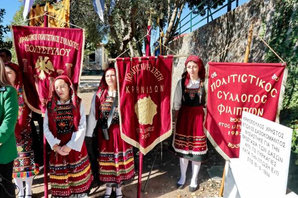 Ακολούθησε η παρέλαση των μαθητών του Δημοτικού Σχολείου Φιλίππων και πολιτιστικών συλλόγων της Δημοτικής Ενότητας Φιλίππων, συνοδεία της Φιλαρμονικής Ορχήστρας Κρηνίδων, και η κατάθεση στεφάνων στο μνημείο πεσόντων.