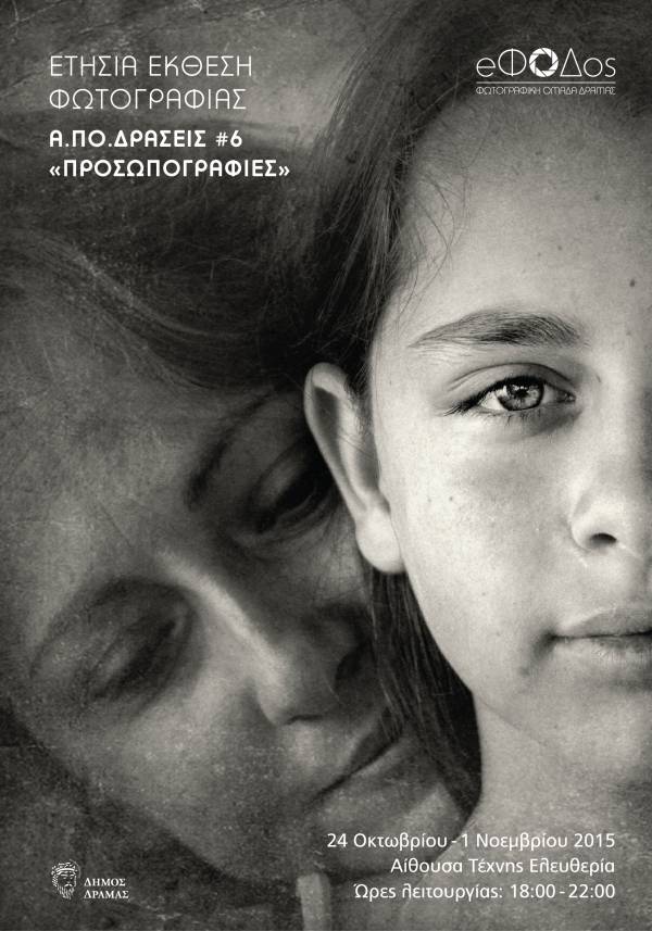 Μεγάλη ομαδική έκθεση φωτογραφίας θα πραγματοποιήσει η Φωτογραφική Ομάδα Δράμας “Ε.ΦΟΔ.ΟΣ” με τίτλο ΠΡΟΣΩΠΟΓΡΑΦΙΕΣ στην αίθουσα τέχνης ΕΛΕΥΘΕΡΙΑ από 24 Οκτωβρίου- 1 Νοεμβρίου 2015.