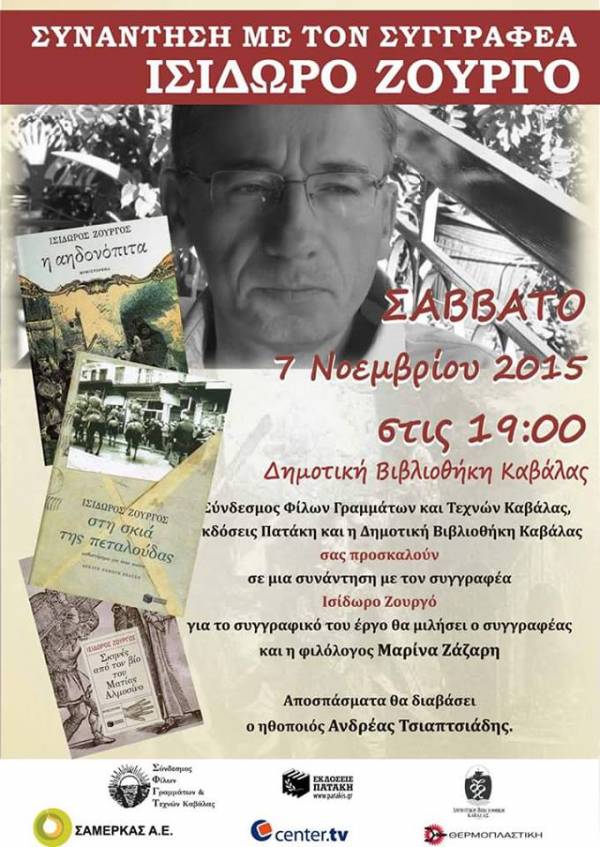 Η Δημοτική Βιβλιοθήκη Καβάλας «Βασίλης Βασιλικός» και ο Σύνδεσμος Φίλων Γραμμάτων και Τεχνών Καβάλας σας προσκαλούν το Σάββατο 7 Νοεμβρίου 2015 και ώρα 19:00 στην αίθουσα εκδηλώσεων σε μία συνάντηση με το συγγραφέα Ισίδωρο Ζουργό. Για το συγγραφικό του έργο θα μιλήσει ο συγγραφέας και η φιλόλογος Μαρίνα Ζάζαρη, αποσπάσματα θα διαβάσει ο ηθοποιός Ανδρέας Τσιαπτσιάδης.