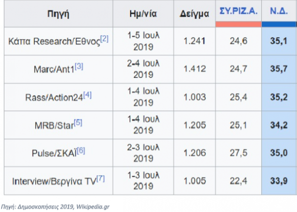 Επικεντρώνοντας πλέον την προσοχή στους δύο διεκδικητές της κυβερνητικής πλειοψηφίας, στον πίνακα που ακολουθεί, μπορεί κανείς να διαπιστώσει πως λίγες ημέρες πριν τις εκλογές της 7ης Ιουλίου του 2019, οι δημοσκοπικές εταιρείες προέβλεπαν μεν την άνετη επικράτηση της Νέας Δημοκρατίας, εν τούτοις «έπεσαν» αρκετά έξω από τα πραγματικά ποσοστά των κομμάτων, με τη διαφορά να κυμαίνεται από τις 4 έως και τις 6 ποσοστιαίες μονάδες!