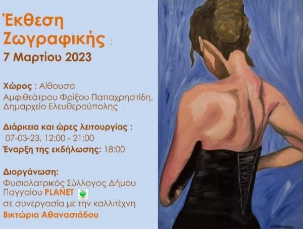 Έκθεση ζωγραφικής με αφορμή την παγκόσμια ημέρα γυναίκας θα πραγματοποιηθεί στις 7 Μαρτίου 2023, στην αίθουσα αμφιθεάτρου Φρίξου Παπαχρηστίδη, στο δημαρχείο Ελευθερούπολης.