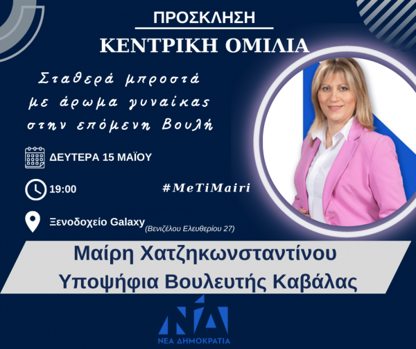 Την κεντρική προεκλογική ομιλία της θα πραγματοποιήσει τη Δευτέρα 15 Μαΐου στο ξενοδοχείο Galaxy η υποψήφια βουλευτής με τη Νέα Δημοκρατία της Π.Ε. Καβάλας, Μαίρη Χατζηκωνσταντίνου.