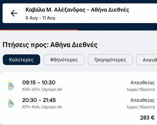 Αντιθέτως η πτήση Καβάλα – Αθήνα κοστίζει 283 ευρώ. Το δρομολόγιο από και προς Αθήνα είναι μόλις μία κάθε μέρα με ένα αεροπλάνο μόλις 72 θέσεων.