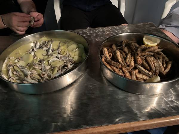 Ο Κωνσταντής έχει πάρει πια τον δρόμο της επιστροφής. Ο Χαμούντα που καθ’ ‘ολη τη διαδικασία βρισκόταν στο βαρκάκι με το οποίο γίνεται το άναμμα και το σβήσιμο τον φανών έχει επιστρέψει με το τέλος της ψαριάς στο σκάφος και έτρεξε κατευθείαν στο μαγερειό του. Τηγάνι και σαγανάκι μπαίνουν στη φωτιά. Ενώ απομένει 1,5 ώρα για να δέσουμε στην Πέραμο, σερβίρεται ως είθισται γαύρος τηγανητός και αχνιστός με σαλάτα και ψωμί.