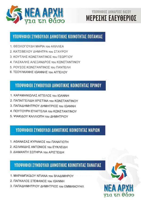 Ο υποψήφιος δήμαρχος Θάσου, Ελευθέριος Μερέσης, ανακοίνωσε όλα τα ονόματα των υποψηφίων του για τις δημοτικές εκλογές του Οκτωβρίου.