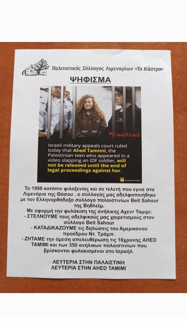 • τα τελευταία χρόνια με αφορμή την φυλάκιση της ανήλικης Παλαιστίνιας Ahed Tamimi εκδώσαμε ψήφισμα καταδίκης  και συμπαράστασης.