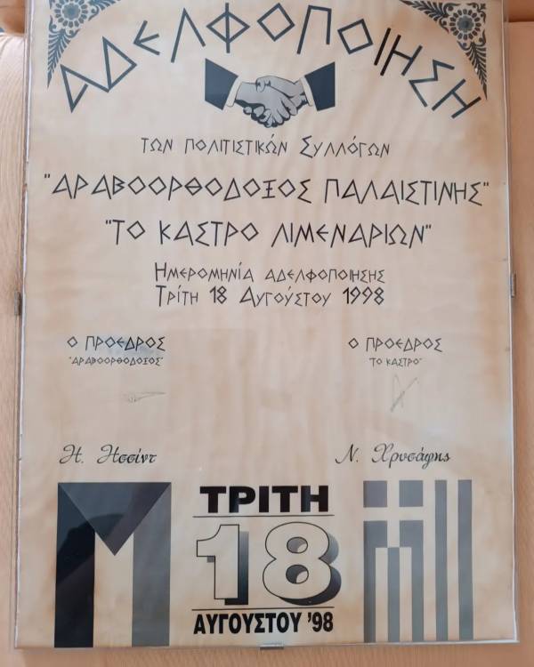 • το 1998 σε μια τελετή που έγινε στα Λιμενάρια Θάσου προχωρήσαμε σε αδελφοποίηση με τον  "Αραβοορθόδοξο Σύλλογο Beit Sahour" της Βηθλεέμ