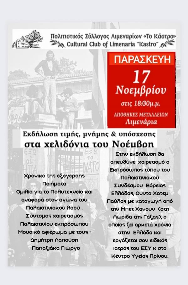 Πρόγραμμα εκδήλωσης: Χρονικό της εξέγερσης, Ποιήματα, Ομιλία για το Πολυτεχνείο και αναφορά στον αγώνα του Παλαιστινιακού λαού.