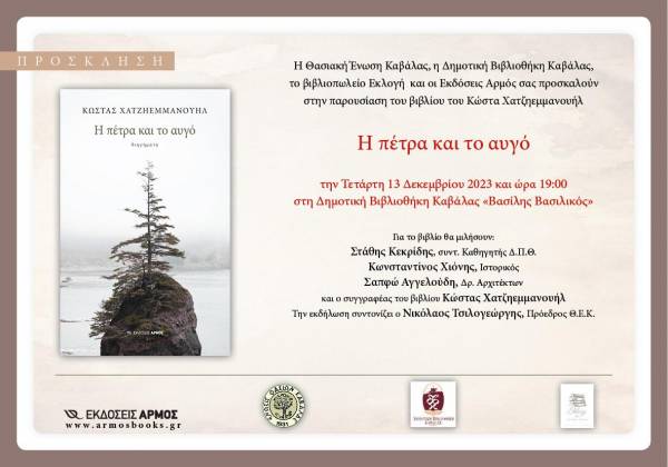 Την Τετάρτη 13 Δεκεμβρίου, στις 19:00 το απόγευμα, στη Δημοτική Βιβλιοθήκη “Βασίλης Βασιλικός”, στην Καβάλα, θα γίνει η παρουσίαση του βιβλίου του Κώστα Χατζηεμμανουήλ “Η πέτρα και το αυγό”.