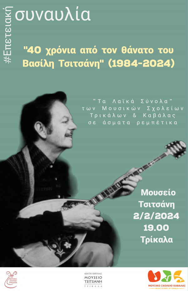 Η εκδήλωση θα πραγματοποιηθεί την Παρασκευή 02 Φεβρουαρίου 2024 στις 19:00 στο Μουσείο Τσιτσάνη, στη γενέτειρα του δημιουργού στα Τρίκαλα.