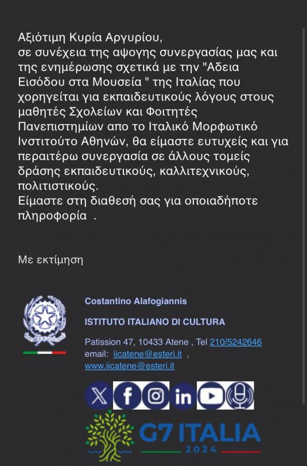 Η σχετική θετική απάντηση του Ιταλικού Μορφωτικού Ινστιτούτου Αθηνών αναφέρει τα εξής: