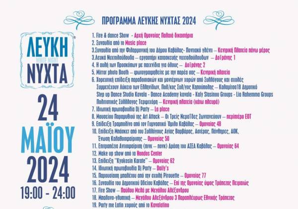 Καβάλα: Το πρόγραμμα των δράσεων της Λευκής Νύχτας της 24ης Μαΐου Παρ, 17/05/2024 - 20:13 Στις 24 Μαΐου θα γίνει μία ακόμη Λευκή Νύχτα στην Καβάλα, από τις 19:00 έως τις 24:00 το βράδυ. Ο Εμπορικός Σύλλογος Καβάλας ενημέρωσε για το πρόγραμμα. Δείτε τις δράσεις της Λευκής Νύχτας.