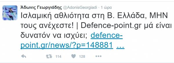 Ο προβοκατόρικος τίτλος «Ισλαμική αθλιότητα στη Βόρεια Ελλάδα, ΜΗΝ τους ανέχεστε» αποτέλεσε και τίτλο του tweet που έκανε ο Άδωνις Γεωργιάδης.