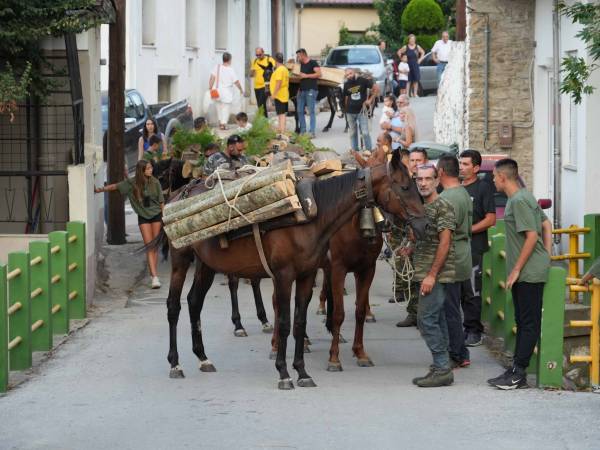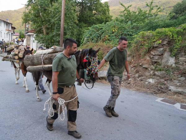 Το απόγευμα κατεβαίνουν με τα στολισμένα ζώα που είναι φορτωμένα με τα ξύλα και ακολουθεί γλέντι στην πλατεία του χωριού.