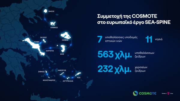 Τον σχεδιασμό, την μελέτη και κατασκευή επτά νέων υποθαλάσσιων υποδομών οπτικών ινών στο Αιγαίο, ανέλαβε η COSMOTE, στο πλαίσιο της συμμετοχής της στο ευρωπαϊκό έργο SEA-SPINE, για την εξυπηρέτηση των τηλεπικοινωνιακών αναγκών έντεκα νησιών του Αιγαίου πελάγους.