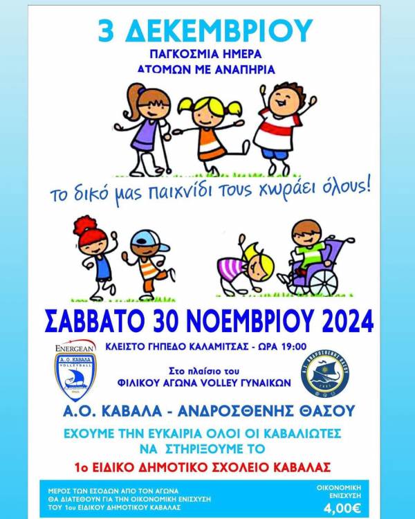 Ο αγώνας θα γίνει με αφορμή την παγκόσμια ημέρα ατόμων με αναπηρία και μέρος των εσόδων του αγώνα θα διατεθεί στο 1ο Ειδικό Δημοτικό Σχολείο Καβάλας!