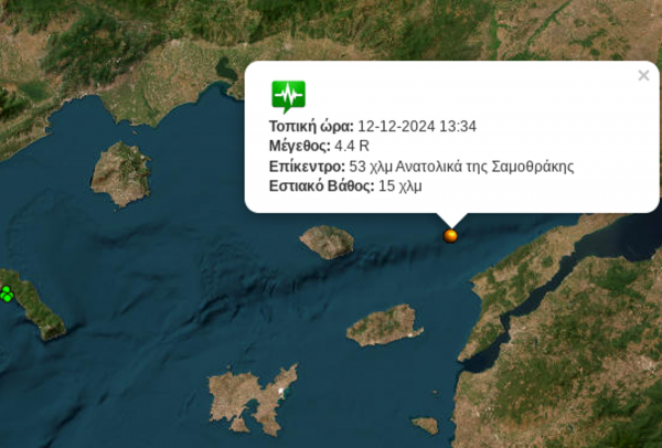 Σεισμός κοντά στη Σαμοθράκη “κούνησε” τη Βόρεια Ελλάδα Πέμ, 12/12/2024 - 15:42 Σεισμός 4,4 ρίχτερ, 53 χιλιόμετρα ανατολικά της Σαμοθράκης, σημειώθηκε το μεσημέρι της Πέμπτης (12/12). Το εστιακό βάθος ήταν στα 15 χιλιόμετρα, ενώ ο σεισμός που έγινε στις 13:34 το μεσημέρι, ήταν αισθητός σε πολλές περιοχές στη Βόρεια Ελλάδα.