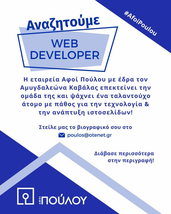 Η εταιρεία Αφοί Πούλου με έδρα τον Αμυγδαλεώνα Καβάλας επεκτείνει την ομάδα της και ψάχνει ένα ταλαντούχο άτομο με πάθος για την τεχνολογία και την ανάπτυξη ιστοσελίδων.