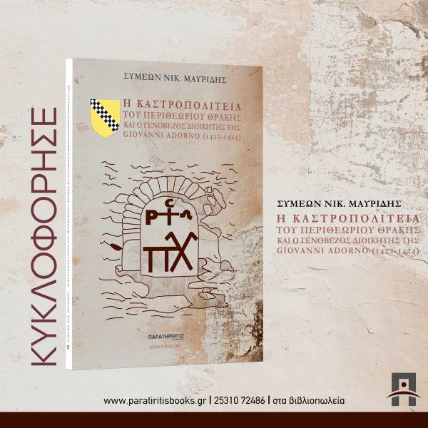 Από τις εκδόσεις Παρατηρητής της Θράκης κυκλοφορεί η νέα ιστορική μελέτη του Καβαλιώτη, Συμεών Μαυρίδη, με τίτλο “Η καστροπολιτεία του Περιθεωρίου Θράκης και ο Γενοβέζος διοικητής της Giovanni Adorno (1422-1424)”.