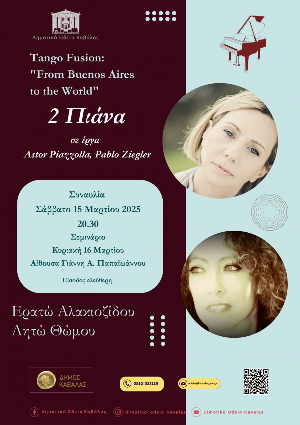 Το Σάββατο 15 Μαρτίου στις 20:30 στην αίθουσα «Γιάννη Α. Παπαϊωάννου» του Δημοτικού Ωδείου Καβάλας, oι καταξιωμένες πιανίστριες Ερατώ Αλακιοζίδου και Λητώ Θώμου θα παρουσιάσουν μία συναυλία για δύο πιάνα με τίτλο: «Tango Fusion: From Buenos Aires to the World» σε έργα του Astor Piazzolla και του Pablo Ziegler.
