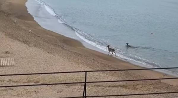 Δυο ελαφάκια κατέβηκαν για μπάνιο στην άδεια παραλία της Μύρινας στη Λήμνο.