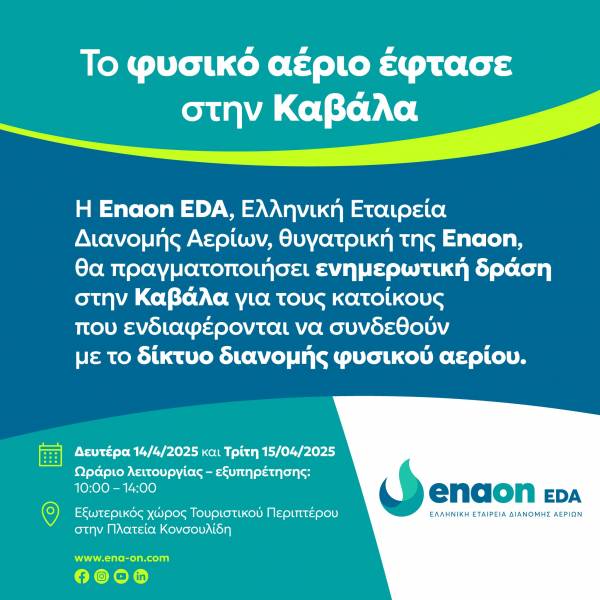 “Η Enaon EDA, Ελληνική Εταιρεία Διανομής Αερίων, θυγατρική της Enaon, ανακοινώνει ότι θα πραγματοποιήσει ενημερωτική δράση στην Καβάλα για την εξυπηρέτηση των κατοίκων που ενδιαφέρονται να συνδεθούν με το δίκτυο διανομής φυσικού αερίου.