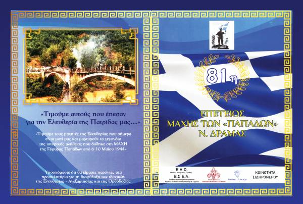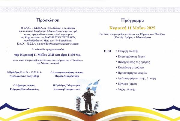 Η Ε.Α.Ο.-Ε.Σ.Ε.Α., η Περιφερειακή Ενότητα Δράμας/Π.Α.Μ.Θ., ο Δήμος Δράμας και η Κοινότητα Σιδηρονέρου θα διοργανώσουν την τελετή εορτασμού της 81ης επετείου της "ΜΑΧΗΣ ΤΩΝ ΠΑΠΑΔΩΝ", που διεξήχθη τον Μάιο του 1944 μεταξύ των Ε.Α.Ο.-Ε.Σ.Ε.Α. και του Βουλγαρικού τακτικού στρατού.