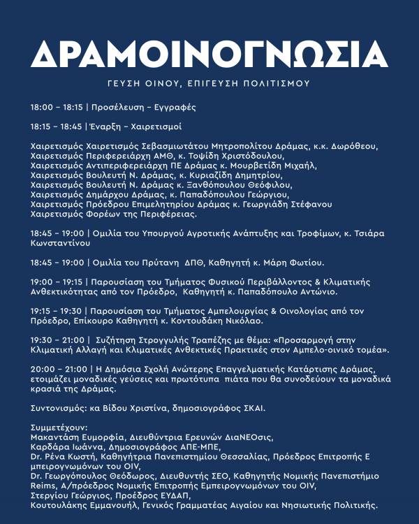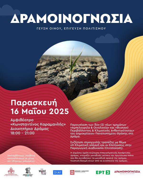 Στη συνέχεια, την ίδια μέρα Παρασκευή 16 Μαΐου και ώρα 18:00- 21:00, στο Αμφιθέατρο «Κωνσταντίνος Καραμανλής» στο Διοικητήριο της Δράμας, θα γίνει η παρουσίαση των δύο νέων τμημάτων του Δημοκρίτειου Πανεπιστημίου Θράκης στη Δράμα «Αμπελουργία Οινολογία» και «Φυσικού Περιβάλλοντος & Κλιματικής Ανθεκτικότητας».