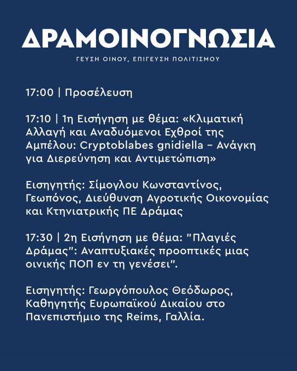 17:10 | 1η Εισήγηση με Θέμα: «Κλιματική Αλλαγή και Αναδυόμενοι Εχθροί της Αμπέλου: Cryptoblabes gnidiella – Ανάγκη για Διερεύνηση και Αντιμετώπιση».
