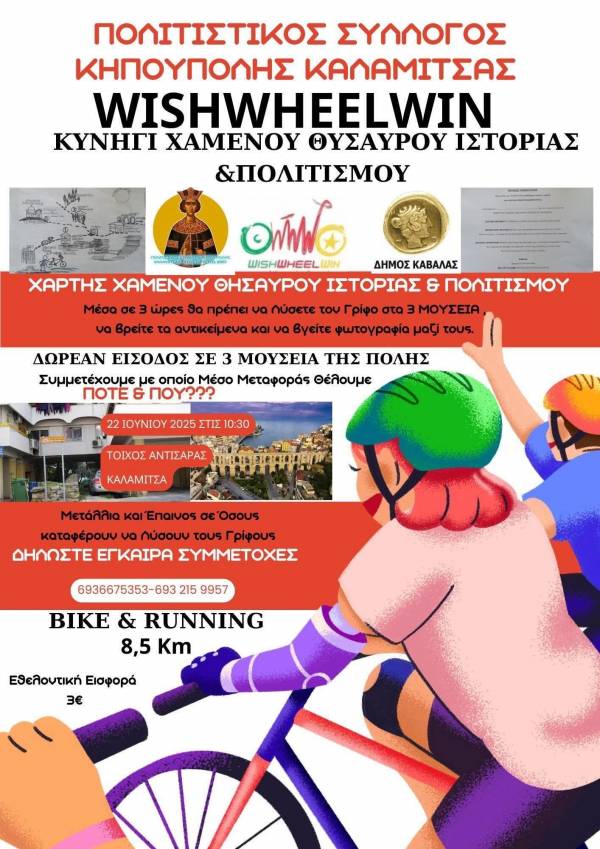 Ο Πολιτιστικός Σύλλογος Κηπούπολης Καλαμίτσας και η ποδηλατική ομάδα του συλλόγου “WISHWHEELWIN” διοργανώνουν, ένα διαδραστικό Κυνήγι Χαμένου Θησαυρού Ιστορίας και Πολιτισμού για άτομα όλων των ηλικιών.