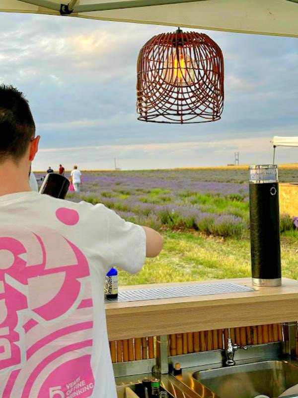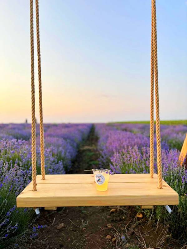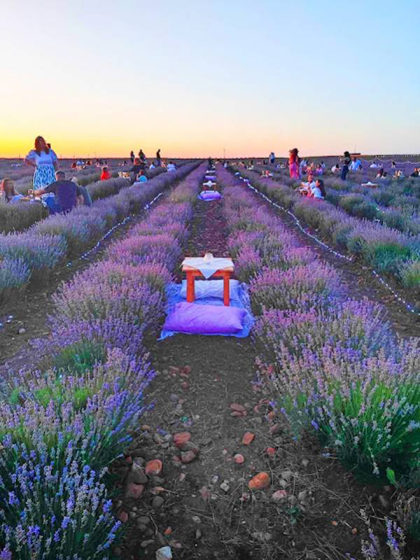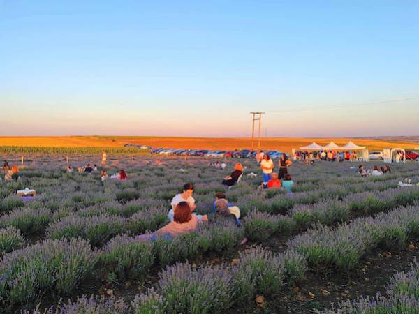 H εμπειρία ήταν εκπληκτική : και ασυνήθιστη καθώς απολαύσαμε έναν πολύχρωμο, αρωματισμένο περίπατο κατά μήκος των ανθισμένων χωραφιών λεβάντας. Ανάμεσα στις υποδειγματικά συντεταγμένες φυτείες του μοβ χρυσού και το μεθυστικό άρωμα των λουλουδιών παρεμβάλλονταν τραπεζάκια με γύρω τους μαξιλάρες για να καθίσουν οι επισκέπτες και να απολαύσουν οίνους της Θρακικής γης.