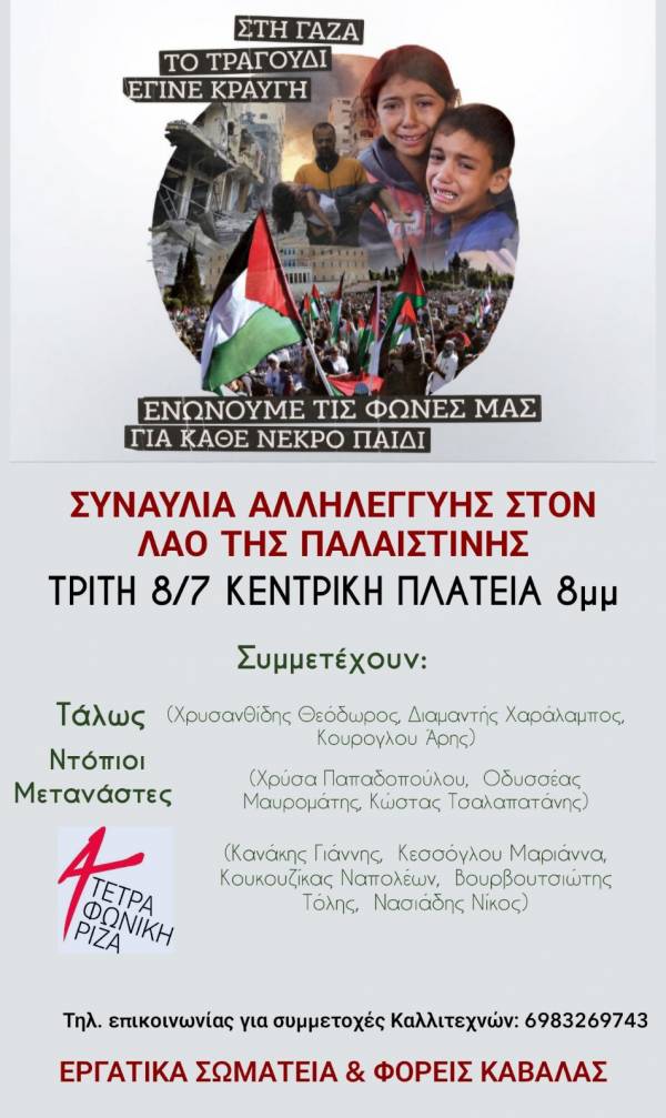 Συναυλια Αλληλεγγύης για τον λαό της Παλαιστίνης διοργανώνουν τα εργατικά σωματεία Καβάλας την Τρίτη 8 Ιουλίου στις 8μμ στην Κεντρική Πλατεία.
