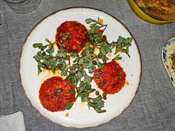 Είμαι σίγουρος ότι θα σας αρέσουν τα γκιόζα (αυτά τα τηγανητά γεμιστά ζυμαρικά, πολύ δημοφιλή στην Ιαπωνία όσο και το ramen) με εποχιακά μυρωδικά, άγρια χόρτα και τουρσί κόκκινης ντομάτας αρωματισμένης με μιρι.