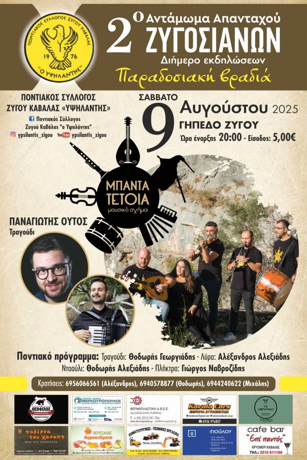 Ο Ποντιακός Σύλλογος Ζυγού Καβάλας "ο Υψηλάντης" σας προσκαλεί σε ένα διήμερο γεμάτο μουσική, συγκίνηση και παράδοση!