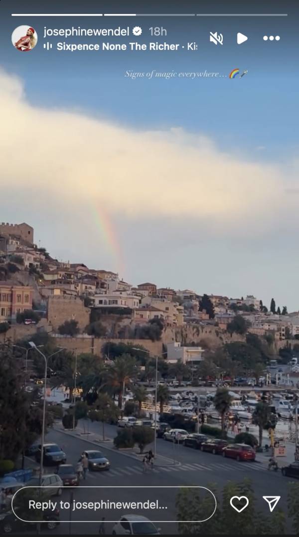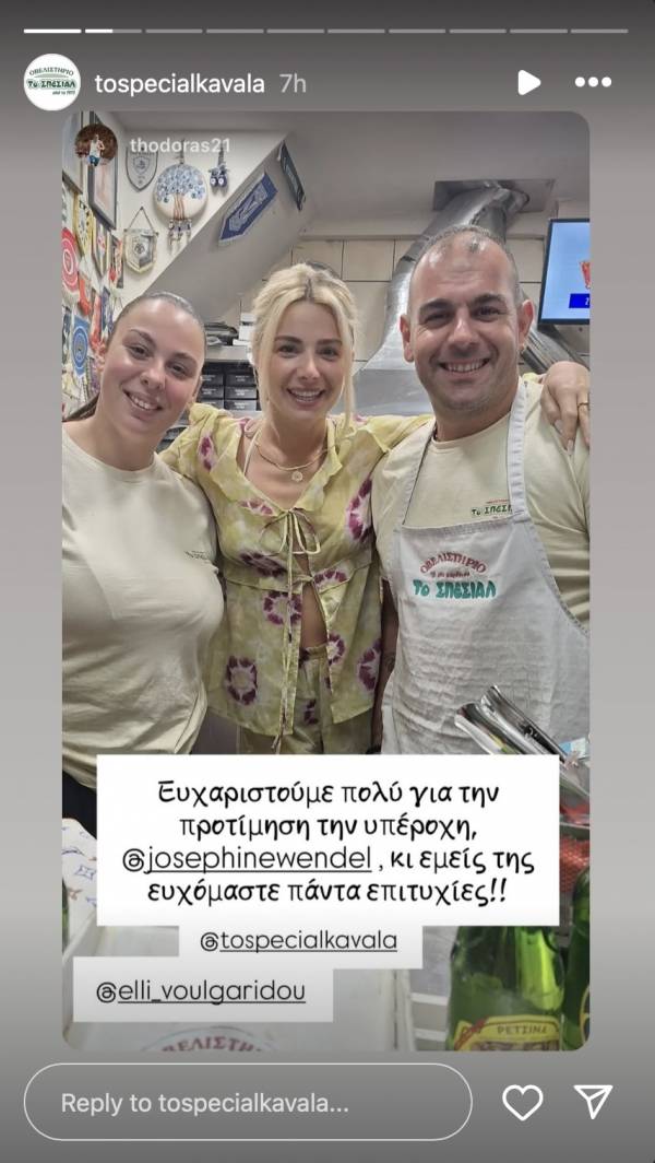 Από τα στορις της μπορεί κάποιος να καταλάβει ότι στο σημείο που διαμένει έχει θέα στο κάστρο της πόλης. Το βράδυ της Τρίτης επισκέφθηκε την περιοχή του Αγίου Νικολάου όπου πέρασε μια βόλτα από το οβελιστήριο «Το Σπέσιαλ». Οι ιδιοκτήτες του καταστήματος φωτογραφήθηκαν μαζί της ενώ έλαβαν και τα θετικά της σχόλια για τις σπεσιαλιτέ που ετοιμάζουν.