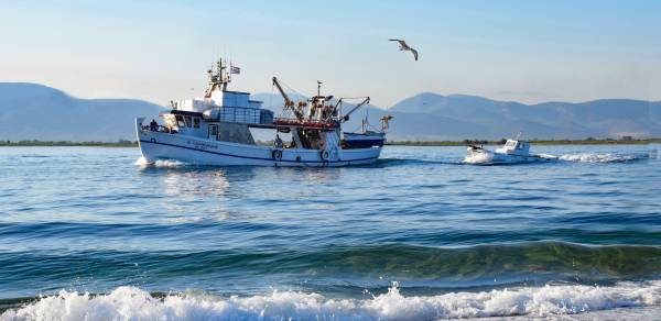 Βλέπουμε ένα καΐκι που βγήκε για ψάρεμα στην Κεραμωτή, ενώ πίσω του βλέπουμε ένα μικρότερο ψαροκάικο.
