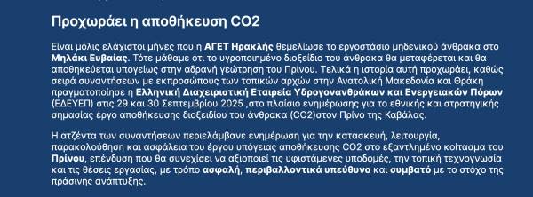 Eίναι μόλις ελάχιστοι μήνες που η AΓΕΤ Ηρακλής θεμελίωσε το εργοστάσιο μηδενικού άνθρακα στο Μηλάκι Ευβαίας. Τότε μάθαμε ότι το υγροποιημένο διοξείδιο του άνθρακα θα μεταφέρεται και θα αποθηκεύεται υπογείως στην αδρανή γεώτρηση του Πρίνου. Τελικά η ιστορία αυτή προχωράει, καθώς σειρά συναντήσεων με εκπροσώπους των τοπικών αρχών στην Ανατολική Μακεδονία και Θράκη πραγματοποίησε η Ελληνική Διαχειριστική Εταιρεία Υδρογονανθράκων και Ενεργειακών Πόρων (ΕΔΕΥΕΠ) στις 29 και 30 Σεπτεμβρίου 2025 ,στο πλαίσιο ενημέρωσης για το εθνικής και στρατηγικής σημασίας έργο αποθήκευσης διοξειδίου του άνθρακα (CO2)στον Πρίνο της Καβάλας.